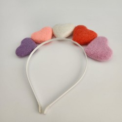 Beyaz taç üzerine renkli yün keçe kalp motifleri kullanılmıştır.