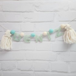 Çeşitli renklerde ip üzerine el yapımı yün keçe top motifleri ile 7 cm ölçülerinde reçine harfler kullanılmıştır.